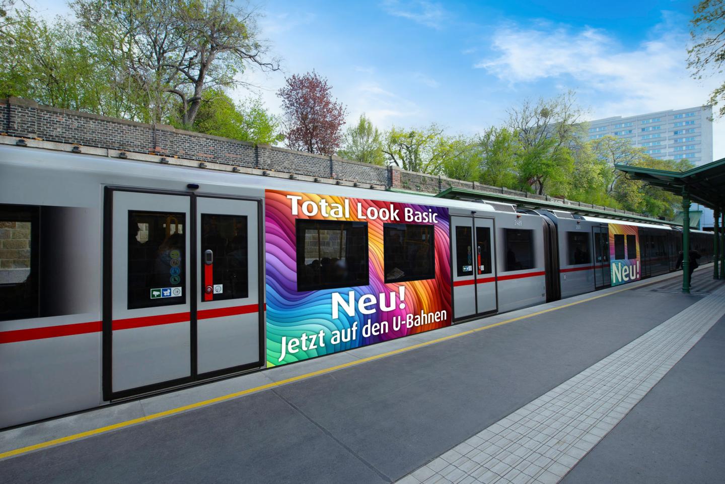Das Paket „Totallook Basic“ kann ab einer Mietdauer von einem Monat oder mehr gebucht werden und bietet reichlich Platz für kreative Umsetzungen. Es umfasst 12 Werbeflächen auf den „V-Wägen“ der Wiener U-Bahn, die auf den Linien U1, U2, U3 und U4 verkehren. Werbetreibende profitieren vom positiven Image des umweltschonenden Fortbewegungsmittels. Weitere Vorteile liegen in der hohen Anzahl an Werbeflächen pro Waggon sowie in der hohen U-Bahn-Frequenz.