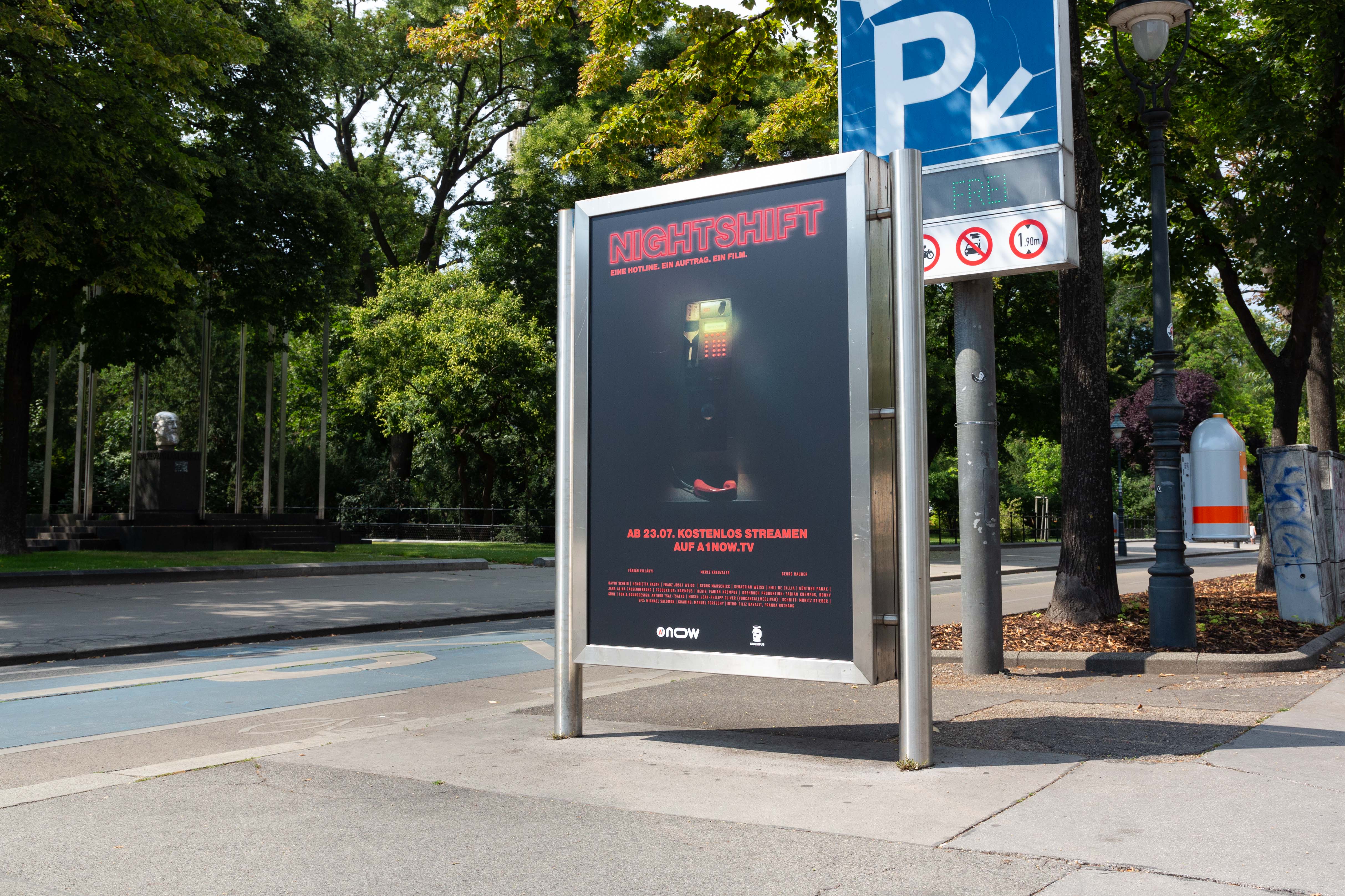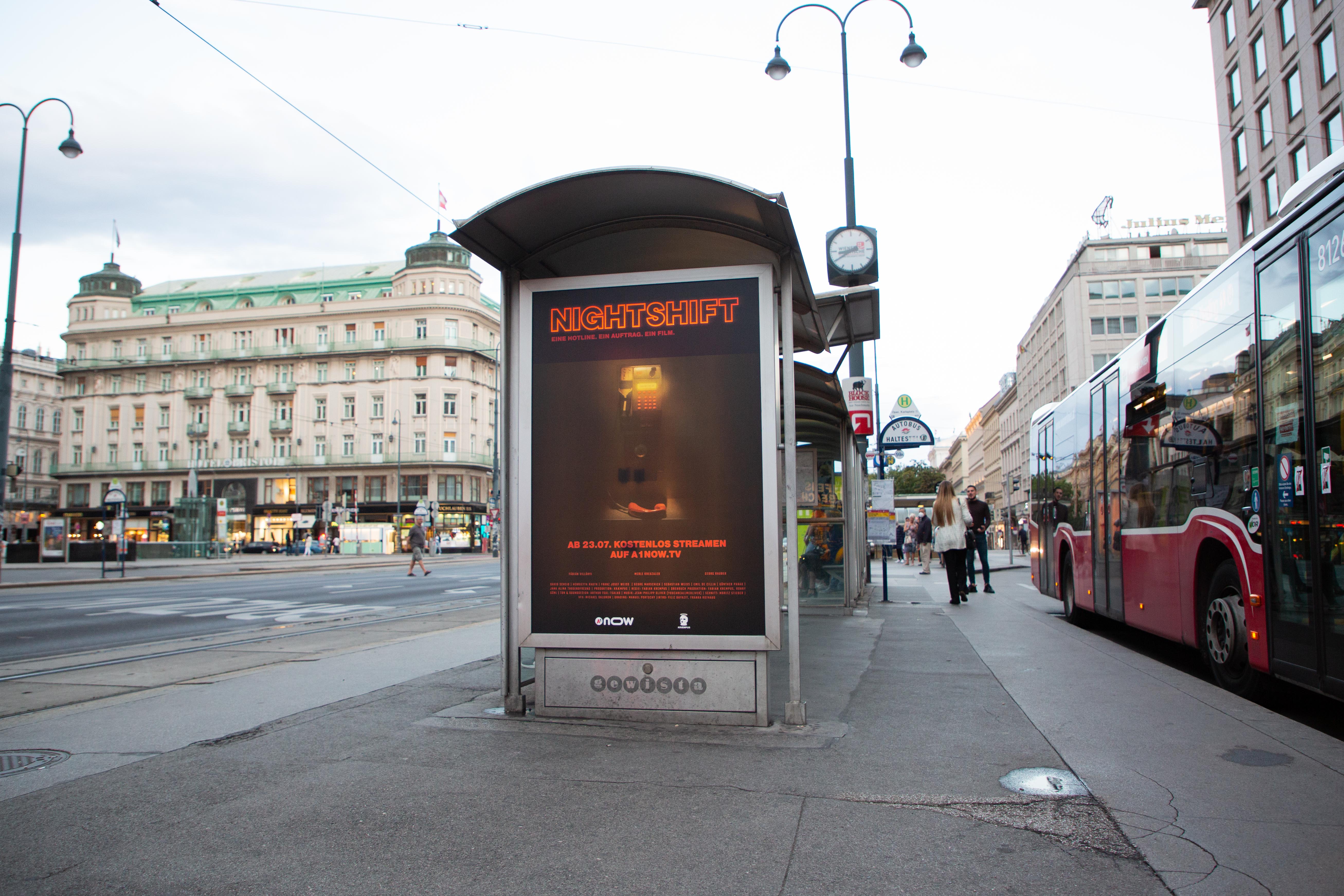 Letztes Jahr erschien „Nightshift“ als Neo-Noir Krimi-Serie bei A1now und erntete großen Beifall der heimischen Filmszene. Weil die Idee und Ausführung so genial zusammenspielte und vor allem ein Spielfilm ein noch größeres Publikum anzieht, wurde dieser auch gleich gedreht. Das cineastische Meisterwerk ist als TV-Premiere am 23. Juli um 20:15 Uhr auf A1now im Fernsehen zu sehen und ab demselben Tag in ganz Österreich kostenlos zum Streamen auf a1now.tv verfügbar. Die Bewerbung des Films im OOH-Bereich findet nicht nur über klassische City Lights, sondern auch über City Light-Sonderwerbeformen statt. Das Sujet zeigt einen öffentlichen Münzfernsprecher und den ausgeplotteten Schriftzug „Nightshift“, der, aus dem Hintergrund beleuchtet, für ein besonderes Dämmerlicht sorgt. Als weiteres Highlight der Inszenierung ist ein Bewegungsmelder integriert der, wenn er ausgelöst wird, ein Telefonläuten und den gesprochenen Hinwies auf die TV-Premiere auf A1now erklingen lässt.