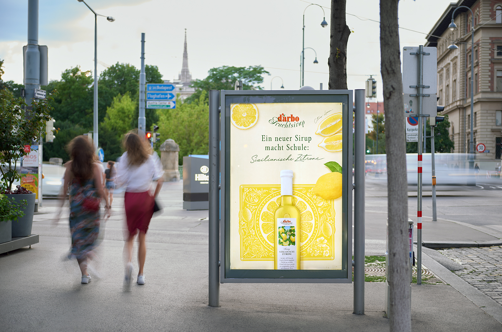City Lights, Plakate und Digitale City Lights der Gewista auf den Straßen Wiens wecken im Juli die Lust auf eine fruchtige Erfrischung und intensiven Genuss von Darbo. Das zitronengelbe Sujet lässt mit dem illustrierten Ornament von Thomas Paster, Bildern aufgeschnittener Zitronen und dem Darbo Fruchtsirup in der unverkennbaren Flasche von heißen Tagen in Italien träumen. Ganz im bekannten verträumten Stil von Darbo.