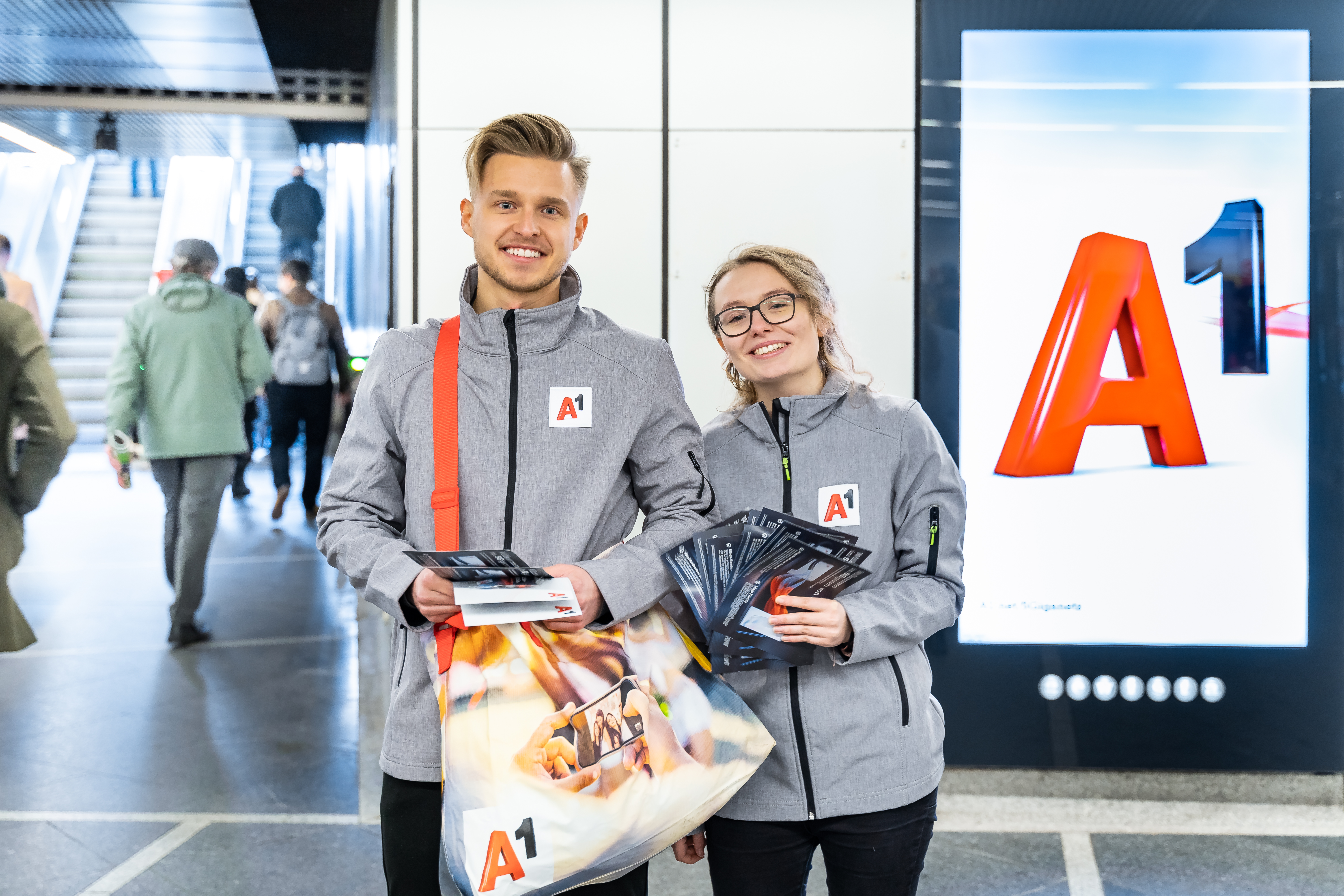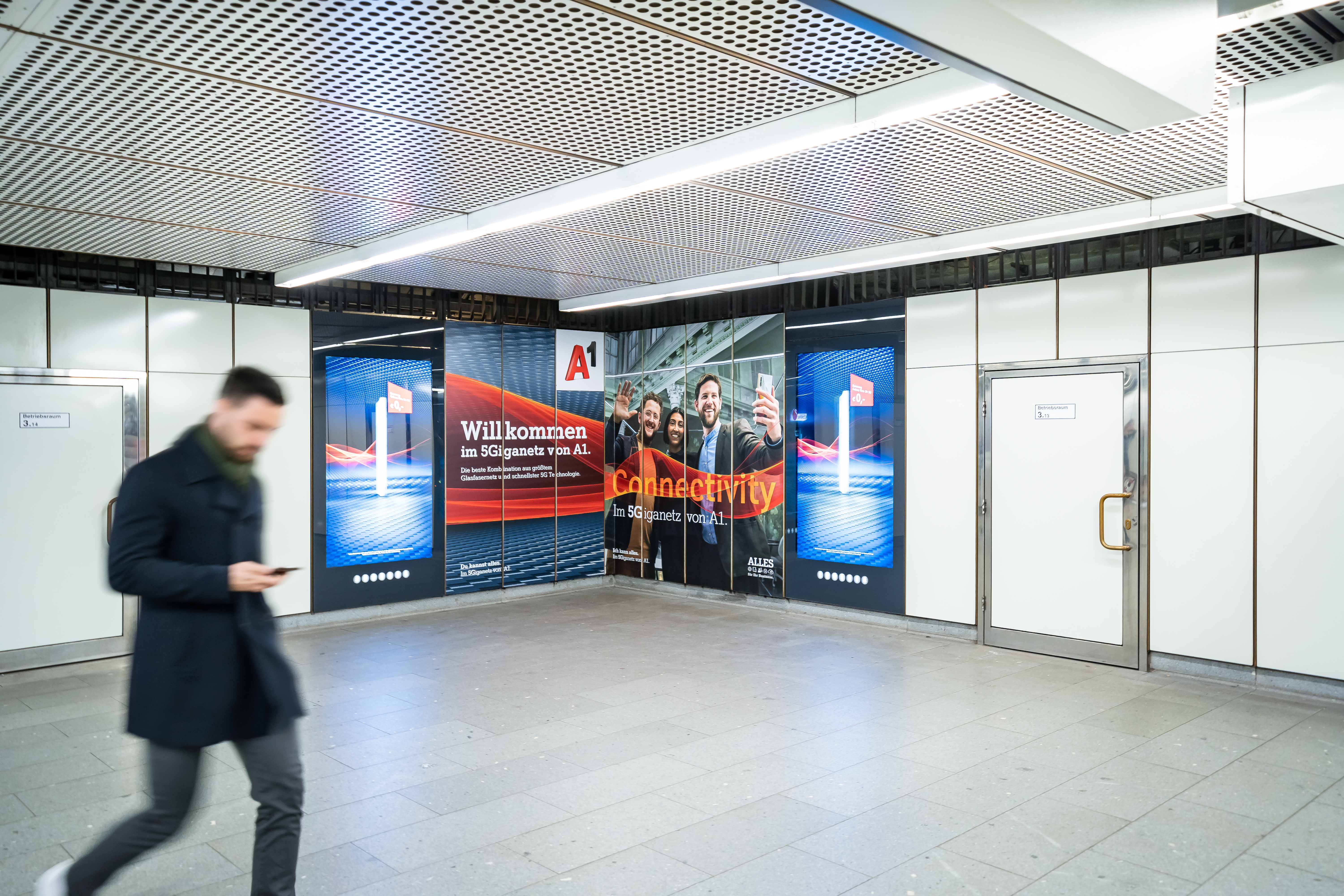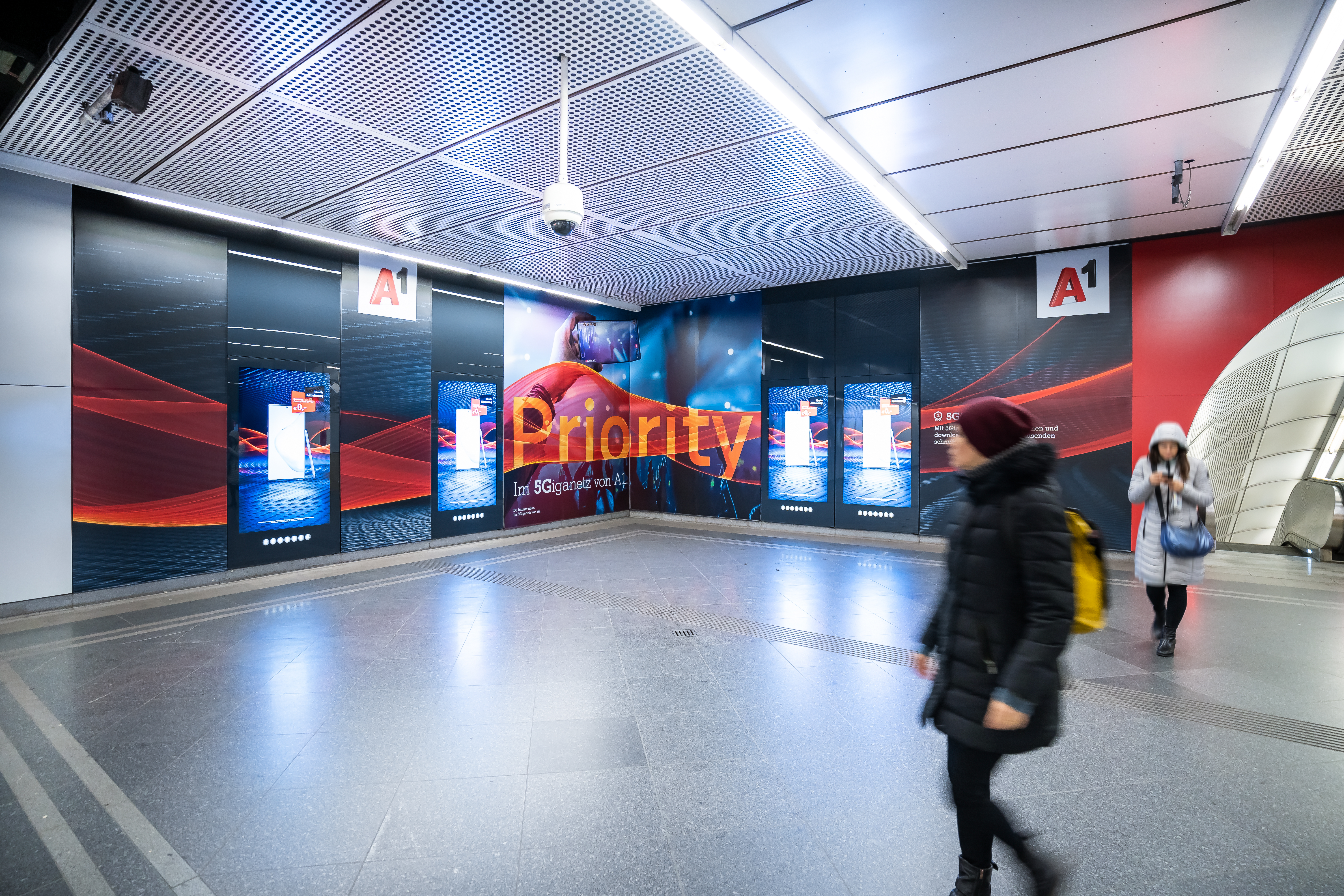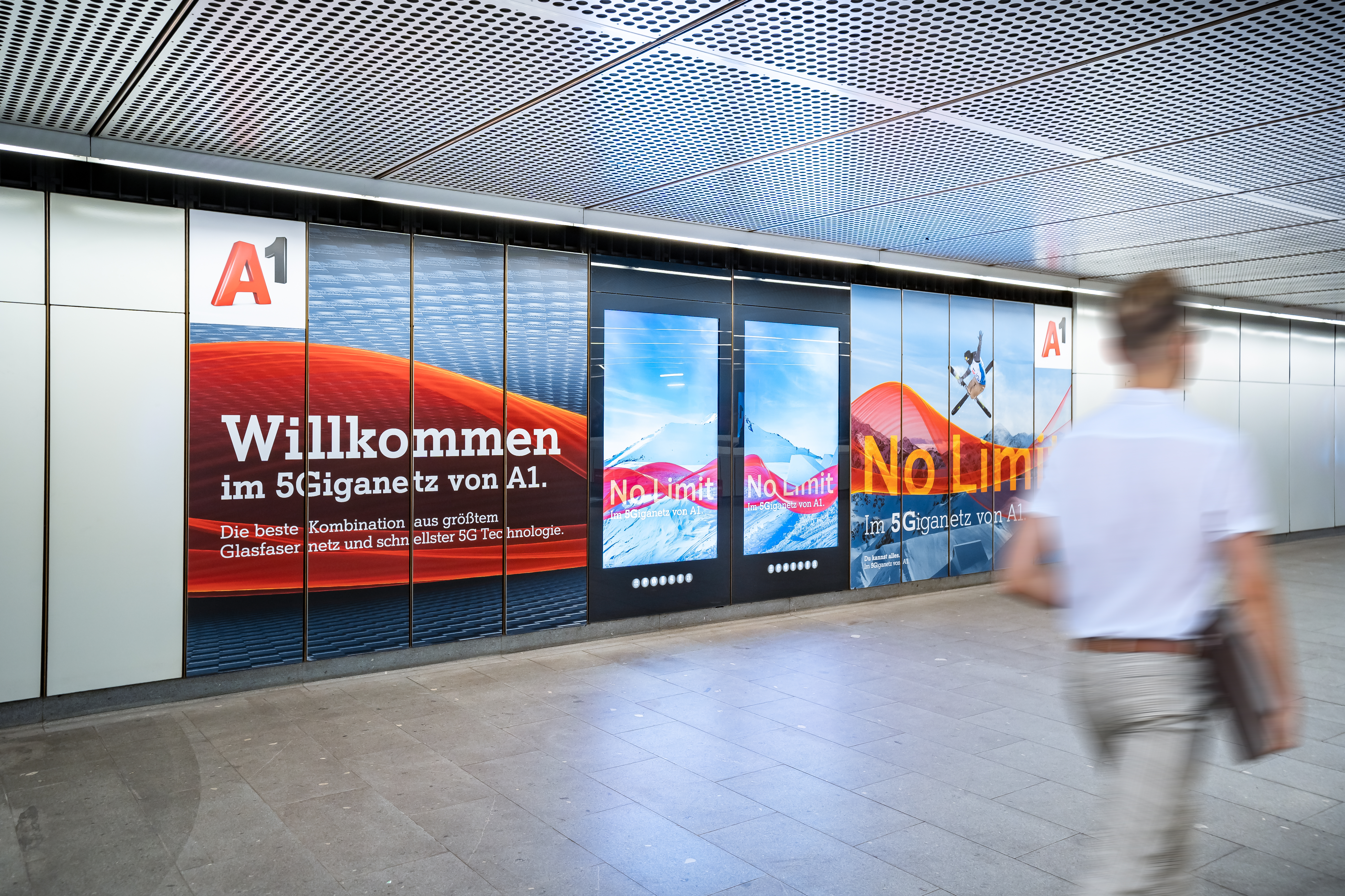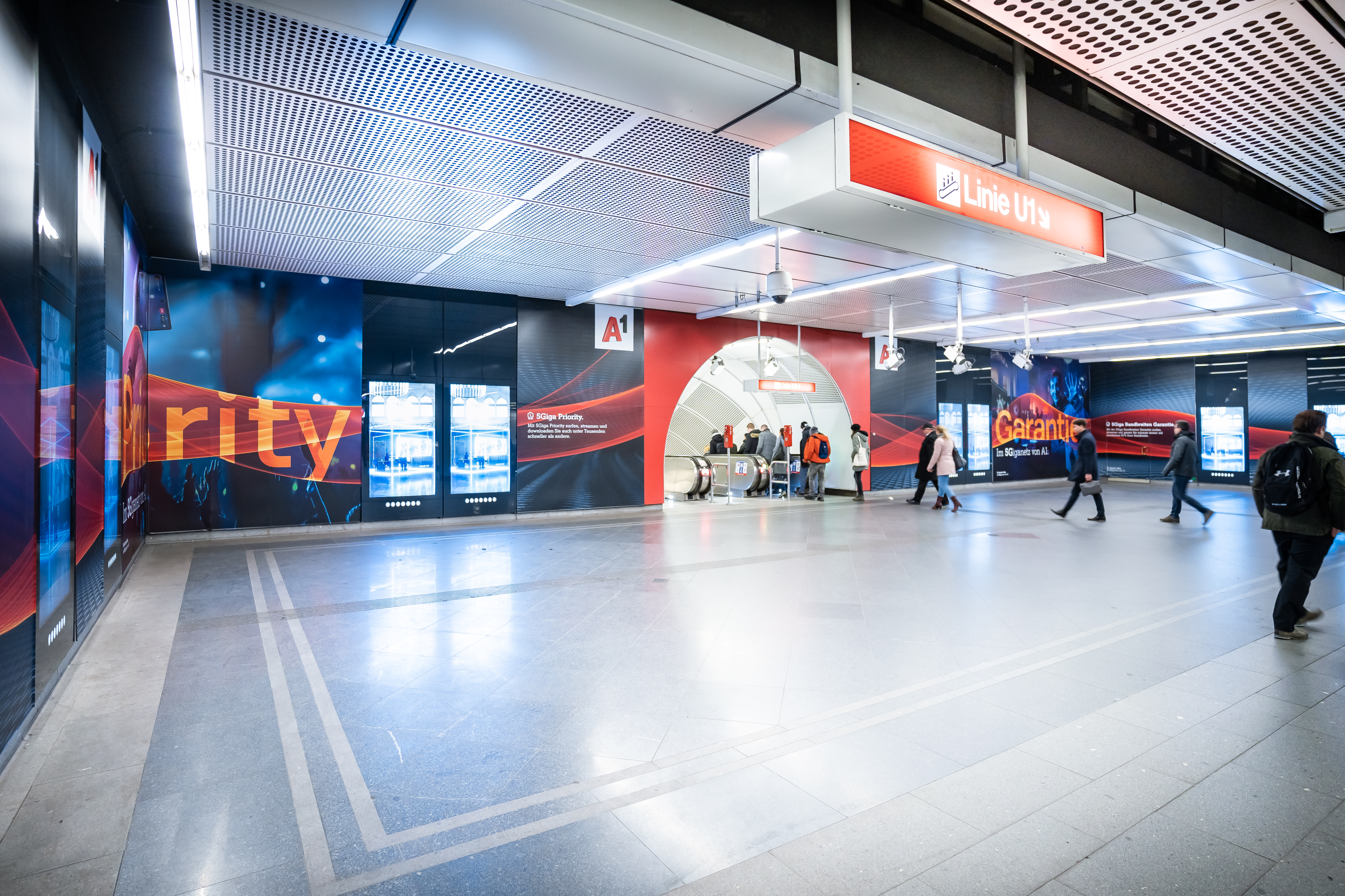 A1 setzt im Zuge der Bewerbung seines A1 5Giganetz auf eine Transport Media-Inszenierung der Gewista: Eine Brand Area mit Sampling Area. Diese kombinierten Out of Home-Werbeformen ermöglichen an der reichweitenstarken U-Bahnstation Stephansplatz gezielte Sampling-Aktionen, die auch digitale City Lights und großflächige Folienbrandings an den Wandflächen verbinden und in Summe eine eindrucksvolle werbliche Präsenz ermöglichen.