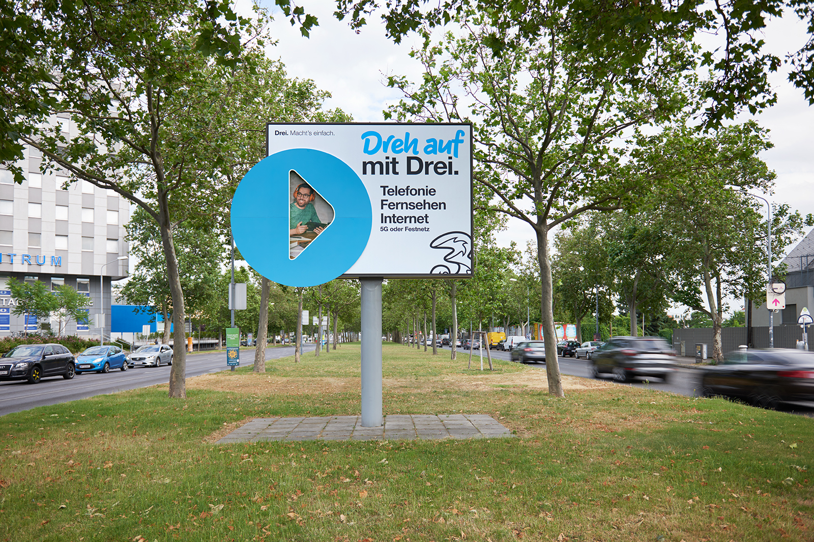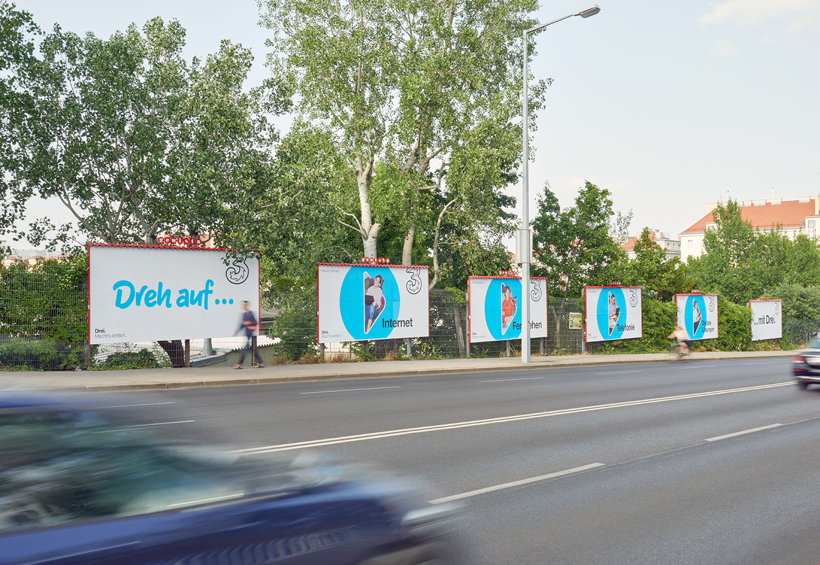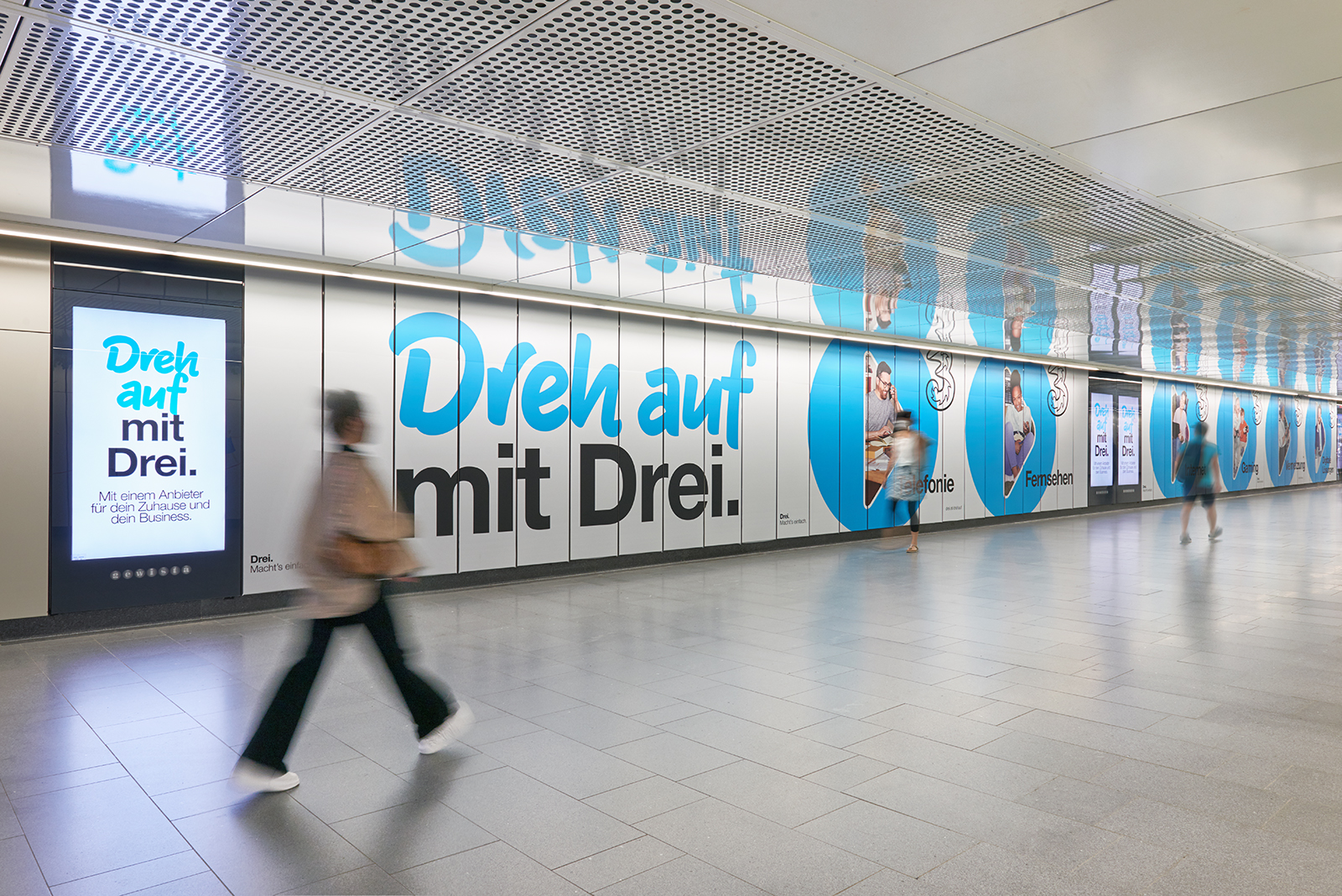 Wenn Drei Österreich wirbt, ist nicht nur der Werbedruck beeindruckend, sondern auch der kreative Output. So setzt der Telekom-Komplettanbieter zur Bewerbung seiner Produkte Telefonie, Fernsehen und Internet, kurz „Dreh auf mit Drei“, auf einen breit angelegten und national gestreuten Out of Home-Mediamix der Gewista. Neben Plakaten und Digitalen City Lights - an der Oberfläche und U-Bahnhöfen - kommen auch kreative Sonderwerbeformen wie Rolling Boards mit Formatsprengung, die an hochfrequentierten Verkehrsknotenpunkten als Eyecatcher fungieren, zum Einsatz. Auch ein Hingucker der größeren Art ist das von Drei Österreich gebuchte Station Branding an der U-Bahn-Station Praterstern. Drei Österreich ist First Mover dieser werblichen Inszenierung am Praterstern, die das gesamte U-Bahn Areal in eine Drei Österreich-Erlebniswelt taucht. Nicht nur die Wandflächen auf den Ebenen, sondern auch entlang der Rolltreppen sind mit Folienbrandings versehen. Auf den zahlreichen Digitalen City Lights, die von den Brandings umgeben sind, laufen, sowohl auch auf den Ebenen als auch entlang der Rolltreppen, Drei Spots.