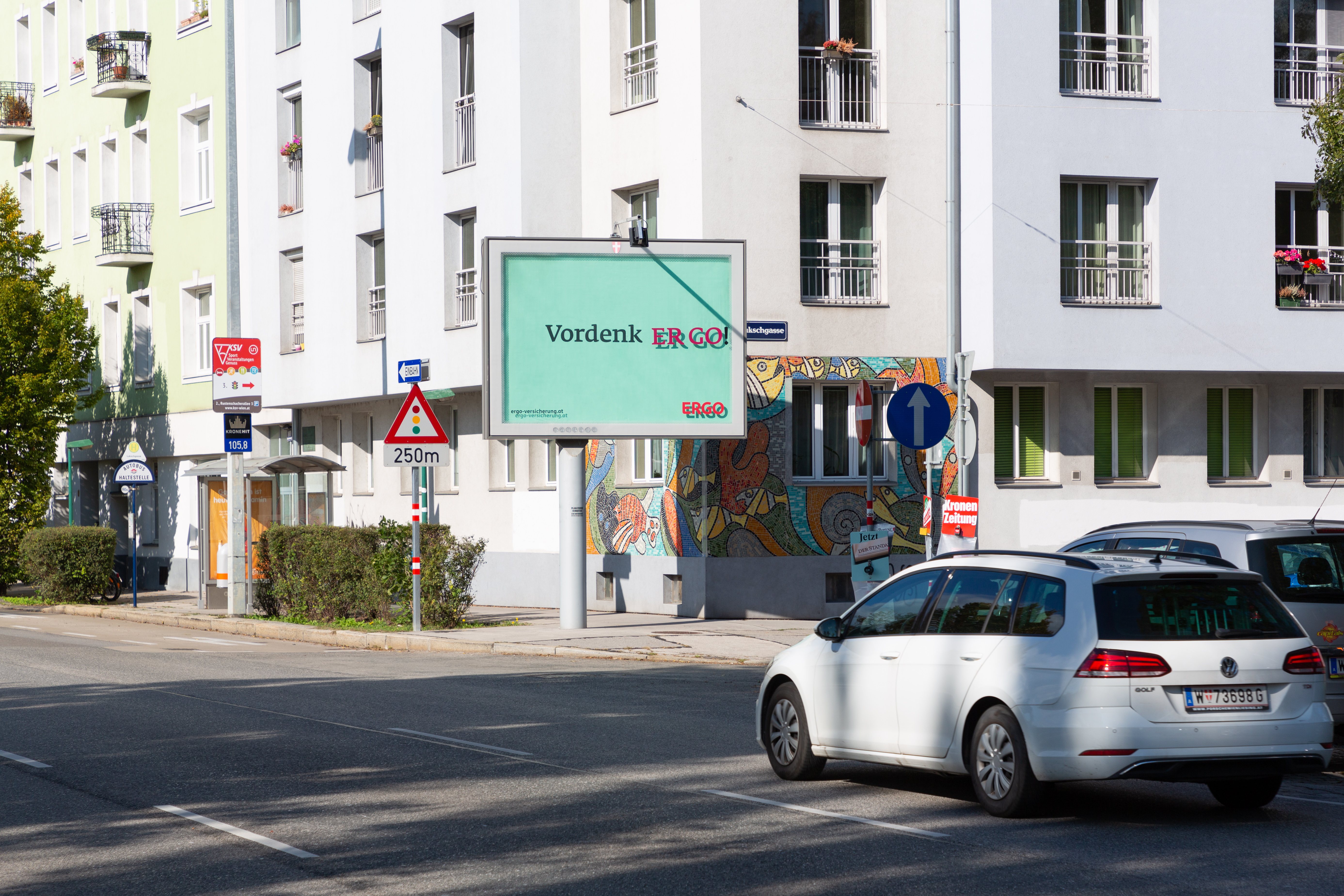 Ein Schwerpunkt der ERGO Versicherung liegt auf Vorsorgelösungen für Privatkunden, denen sie hochwertige Produkte anbietet: Von umfassenden Lebens- und Unfallversicherungen über Sachversicherungen wie Kfz und Haushalt/Eigenheim sowie Gewerbe- und Industrieversicherungslösungen für Firmenkunden. Um auf die Marke ERGO und auf das breite Produkt- und Dienstleistungsportfolio aufmerksam zu machen, setzt das Unternehmen auf eine nationale Rolling Board-Kampagne der Gewista. Neben klassischen Rolling Boards nutzt ERGO auch eine Sonderwerbeform auf diesem Medium. Auf der Glasfläche des Mediums ist eine Folie angebracht die den Firmennamen ERGO mit geringem Abstand als ER und GO voneinander trennt. Die im Hintergrund rollierenden Sujets ergeben in direktem Anschluss an die Buchstaben ER unterschiedliche Wörter die mit dem zweiten Teil des Firmennamens GO - Dynamik symbolisierend -, enden. Daraus ergeben sich Wortkombinationen wie TräumER GO!, VordenkER GO!, DurchstartER GO! sowie FairER GO! MiteinandER GO! und UmdenkER GO!. Die Rolling Boards sind in einer nationalen Streuung in Wien, Graz, Klagenfurt, St. Pölten, Salzburg, Innsbruck sowie Bregenz im Kampagnenzeitraum Oktober bis November an reichweitenstarken Standorten zu sehen.