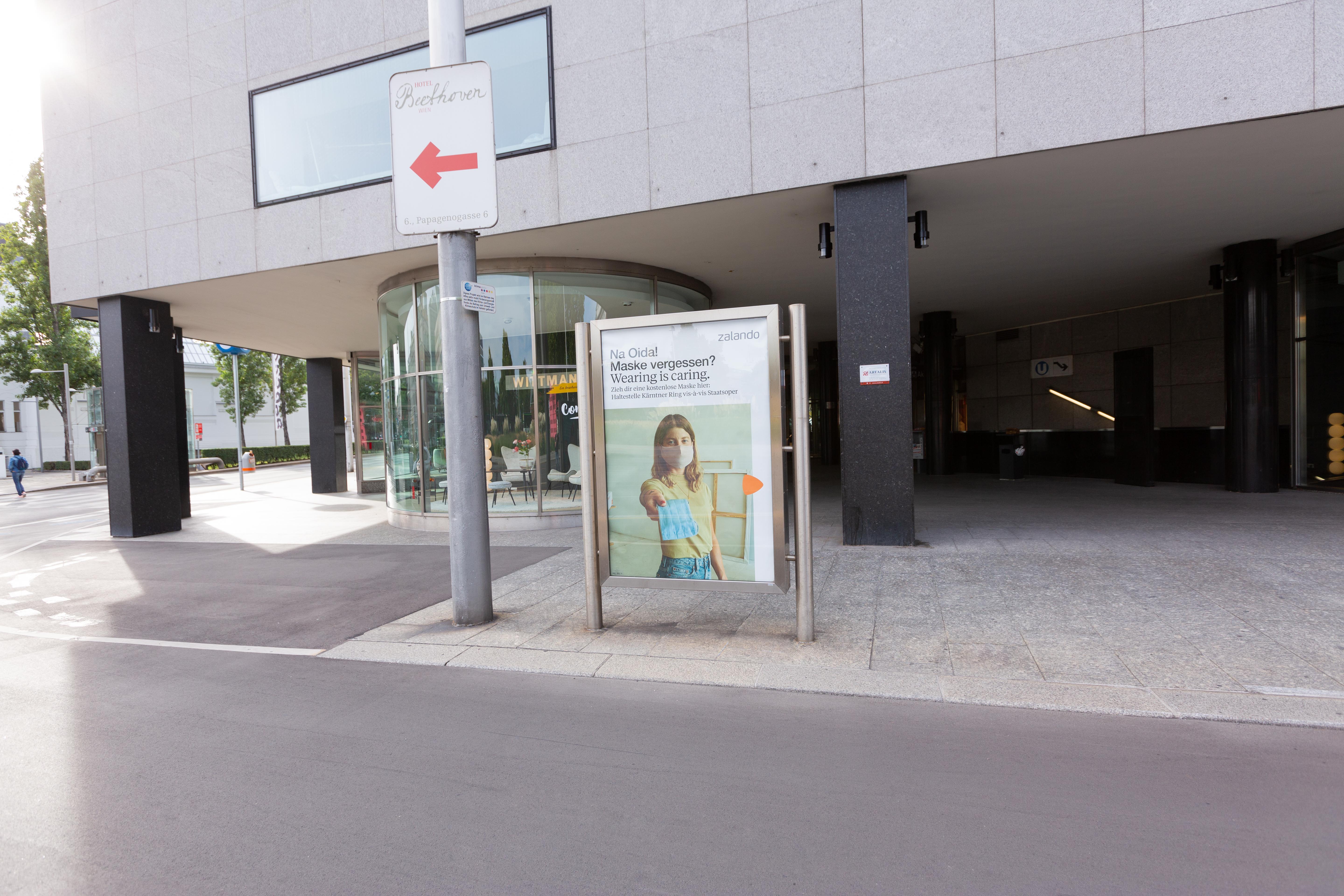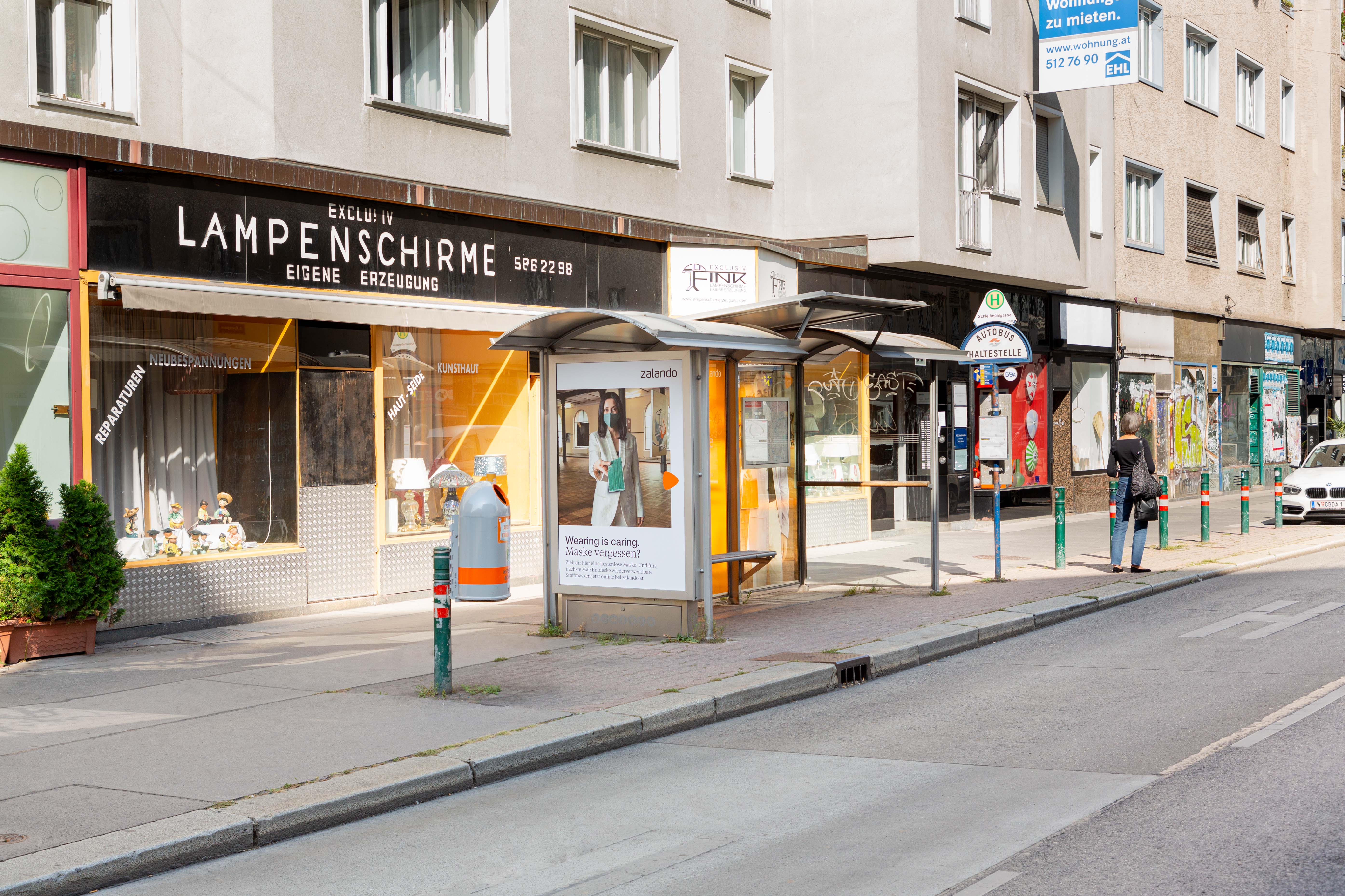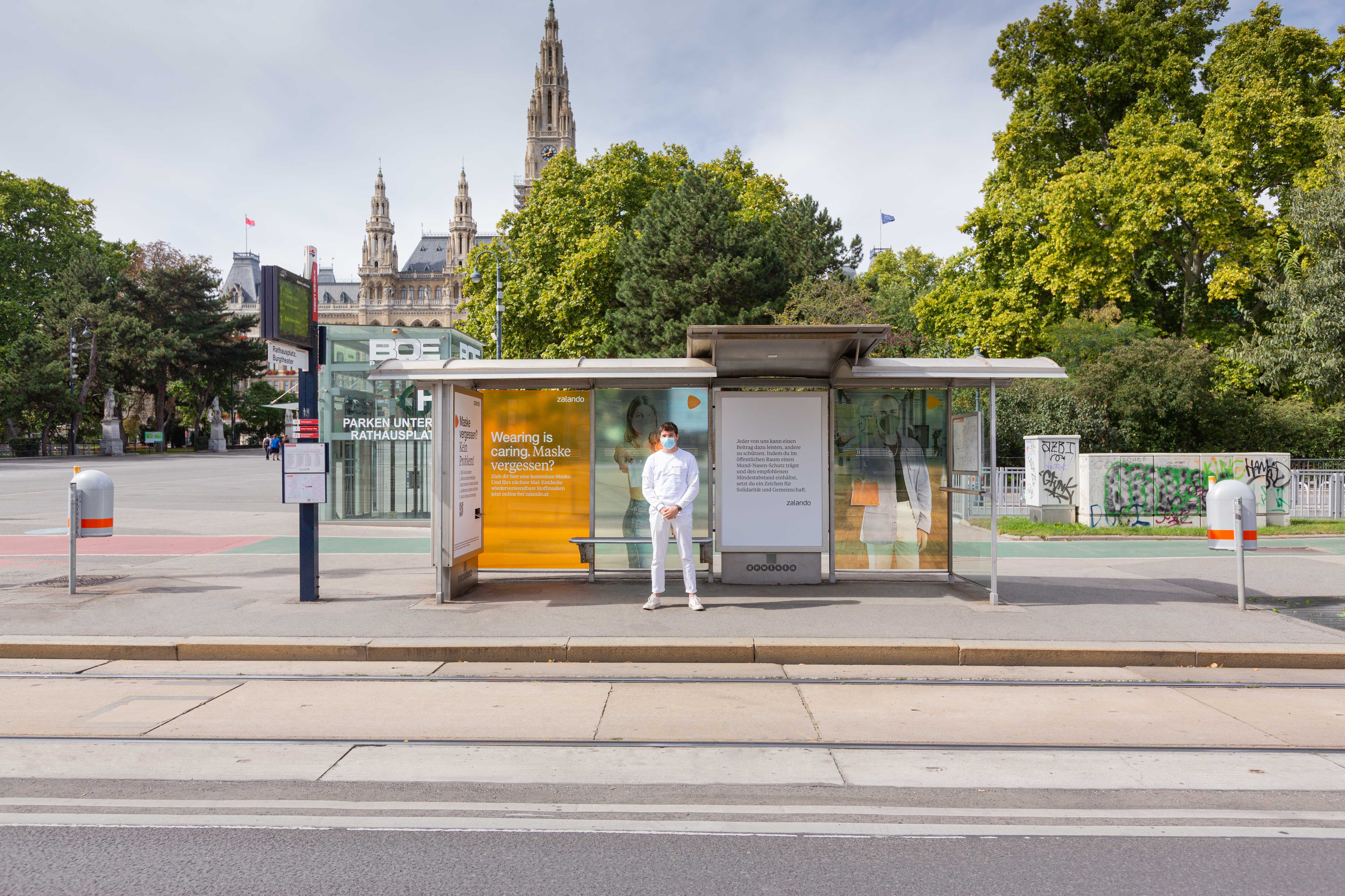 An sechs hochfrequentierten Standorten in Wien setzt die Gewista für Zalando via Wartehäuschen-Sonderwerbeformen eine kreative Sensibilisierungskampage zum Thema MNS-Schutz unter dem Motto „Na Oida! Maske vergessen? Wearing is caring.“ um. Gerade direkt vor dem Einsteigen in öffentliche Verkehrsmittel wird daran erinnert einen MNS zu tragen. Für alle die Ihren vergessen haben, schafft Zalando hier Abhilfe. Das im Total Look -Folien an den Glasflächen in Kombination mit City Lights-  gebrandete Wartehäuschen ist ein optischer Hingucker und die darin befindlichen City Lights fungieren als MNS-Dispenser. Auf dem City Light-Sujet reicht ein weibliches Testimonial symbolisch einen MNS der auch haptisch einfach zu bekommen ist. Die Passanten gelangen über das Scannen eines QR Codes am Sujet, mittels Smartphone oder Tablet, direkt auf eine eigene Zalando Landing Page. Durch betätigen des dort aufscheinenden Zalando-Buttons wird am City Light über einen Dispenser in Echtzeit einzeln verpackte MNS ausgegeben. Der Fahrt in den Öffis oder einem anderen MNS-pflichtigen Ort steht nichts mehr im Wege. Die Wartehalleninszenierung wird im Out of Home-Mediamix mit klassischen City Lights unterstützt die auf den Sujets auf die in nahem Umfeld befindlichen Wartehäuschen, inklusive Adressnennung, hinweisen.