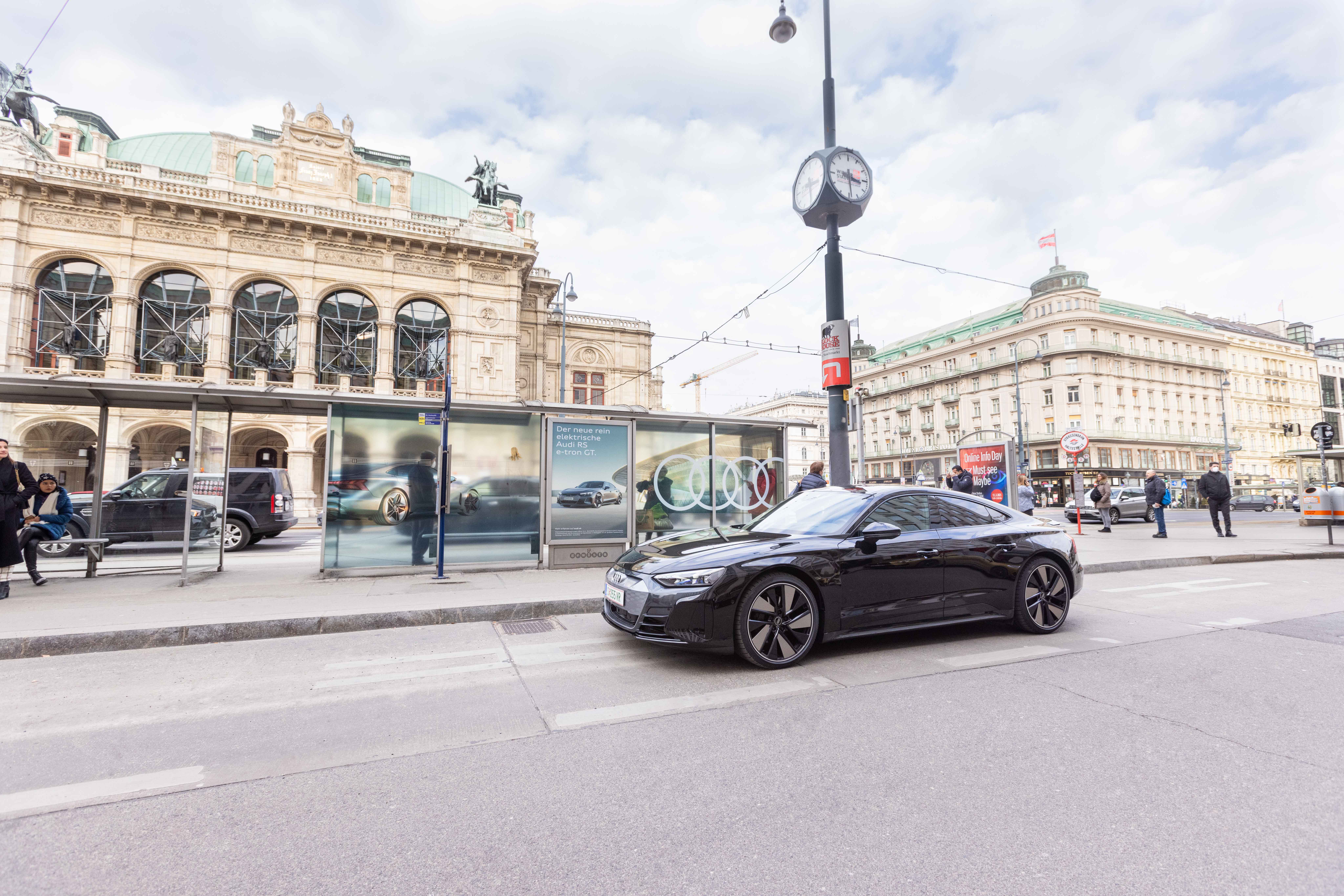 Audi is promoting its new Audi RS e-tron GT vehicle as part of its current campaign and is relying on an Out of Home-media mix from Gewista to introduce this beautiful Gran Turismo model to a wide audience. In addition to digital City Lights, a new creative, special advertising form, a bus shelter branding in total look with HoloCIRCLE technology, is also being utilized. The high-impact location of this eye-catcher is prominent on Vienna's Ringstrasse, directly in front of the Opera House, where there is a continual flow of human traffic, an ideal target group, as people are driving by or waiting for the streetcar, and are receptive to the prominent message.