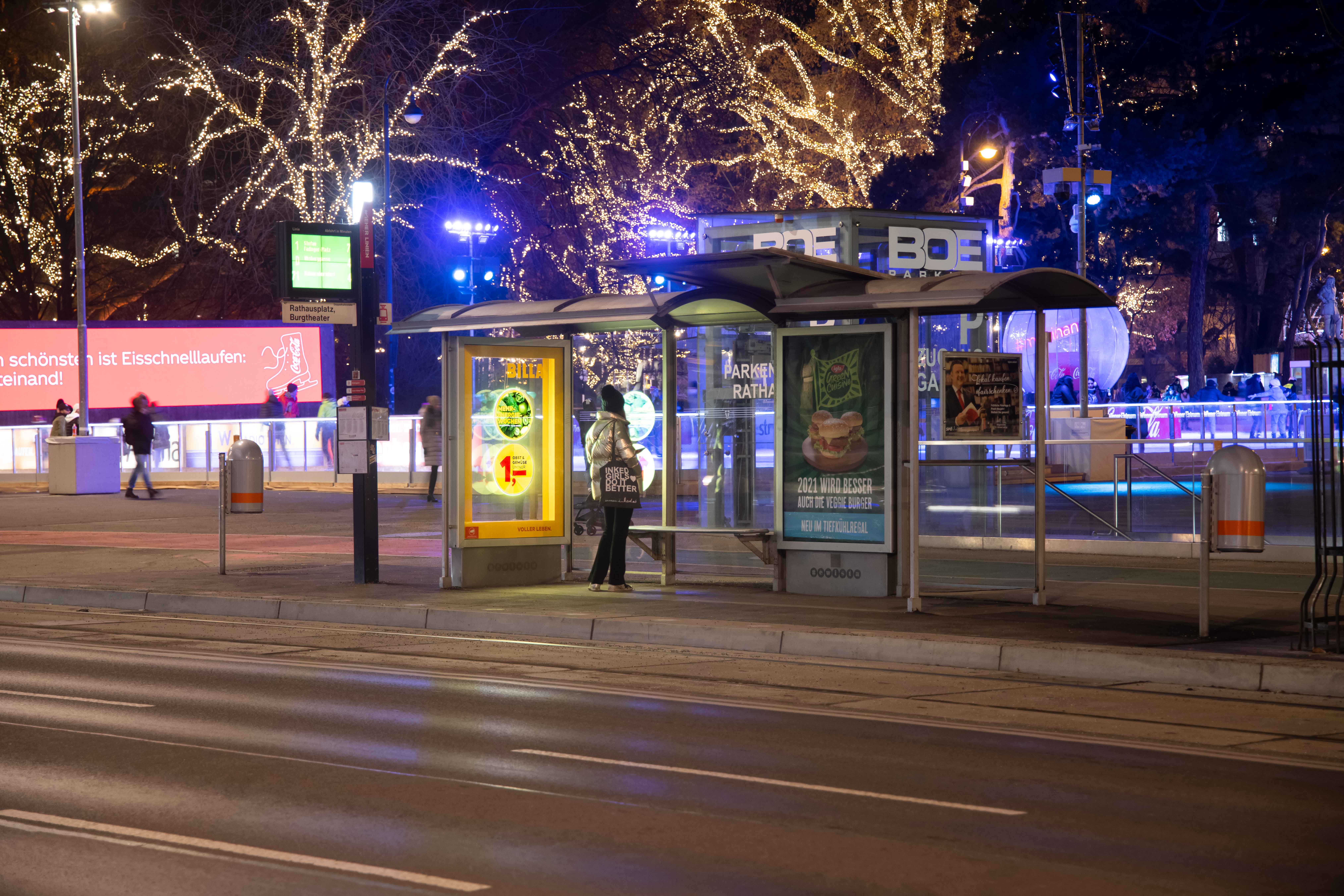 16 und 24 Bogen Plakate inkl. Dominanz-Affichieren entlang der Wiener Triester Straße, analoge und digitale City Lights, Holocircel Sonderwerbeform in City Light-Wartehallen (1010 Opernring 1, 1010 Stubenring 4, 1010 Universitätsring geg. 2, Burgtheater, 1040 Operngasse 36 und 1070 Siebensterngasse 31)