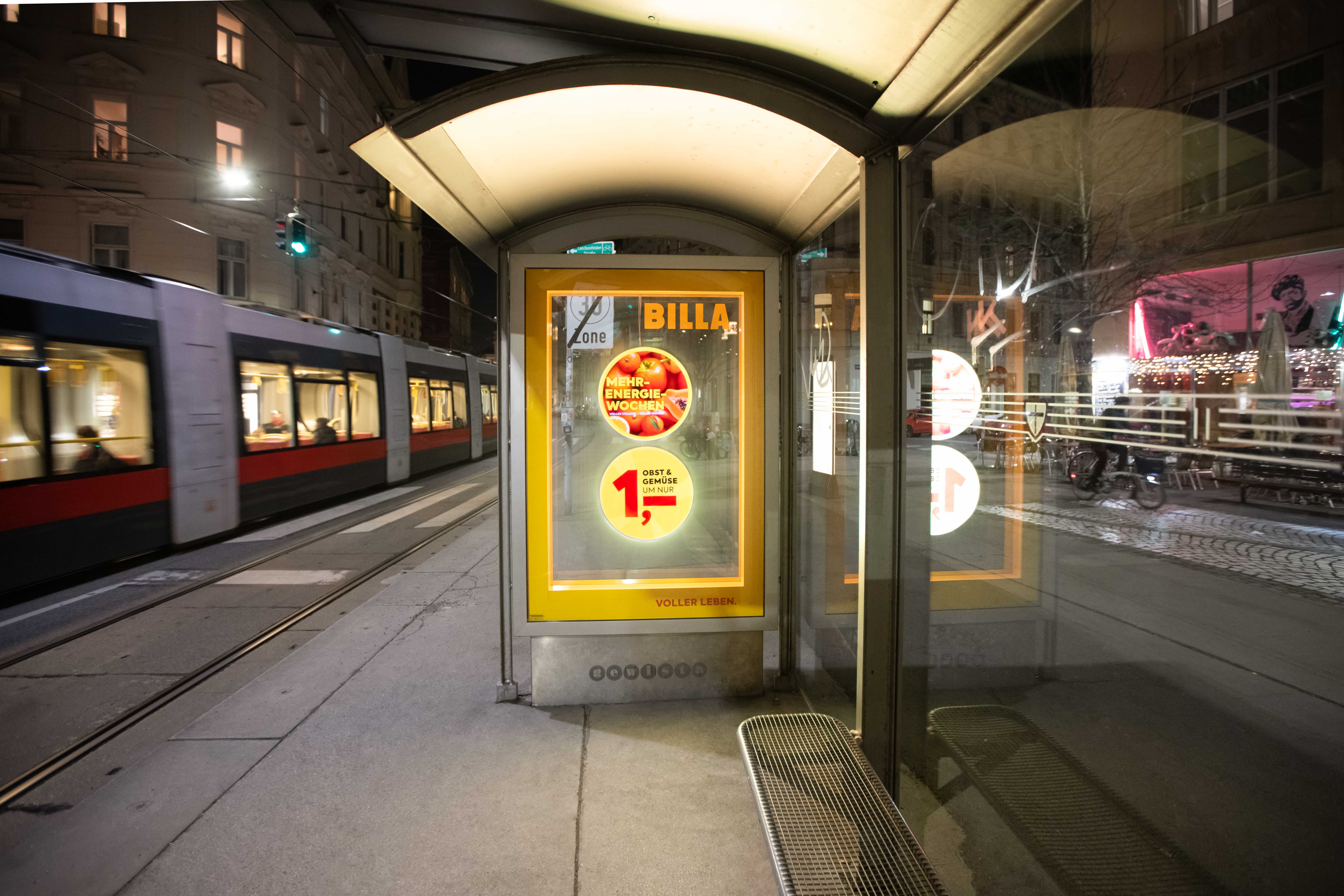 BILLA is starting the new year with a new campaign under the motto "More Energy Weeks." The focus is on selected fruit and vegetables offered for just 1 Euro. The campaign is being staged via Gewista's broad-based Out of Home-media mix and, in addition to classic posters, analog and digital City Lights, also includes a special form of advertising that is being implemented for the first time in Austria: the HoloCIRCLE. This OOH-novelty was conceived and implemented in collaboration with the digital creative agency TUNNEL23.