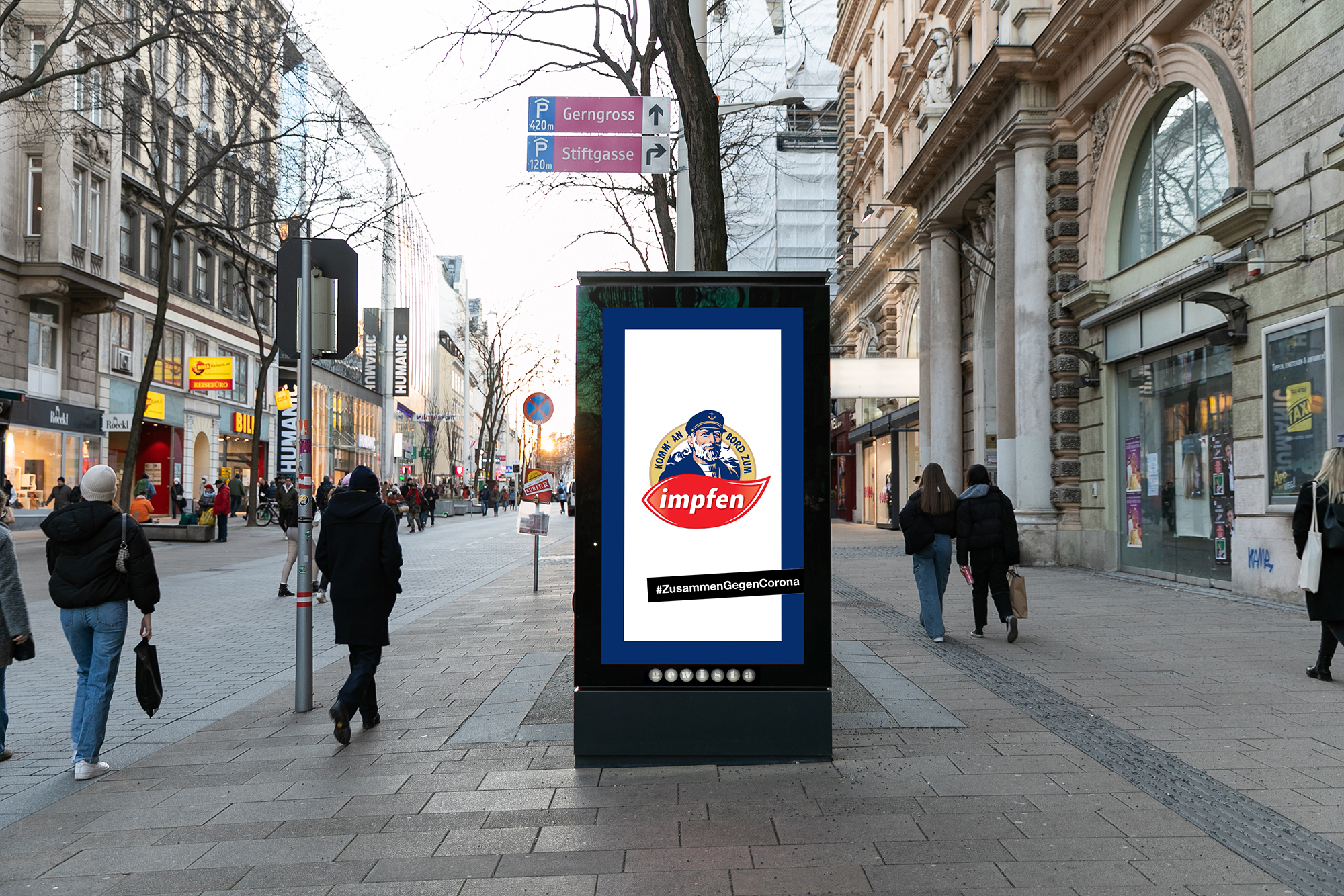 Many companies are now using Gewista as a platform for their pro-vaccination messages. Most rely on a modification of their existing advertising concepts adapted to a pro-vaccination appeal, often creatively staged and, also, with a bit of a wink. This distribution is on 1,500 City Lights and up to 600 digital screens.  The program runs until the end of January.