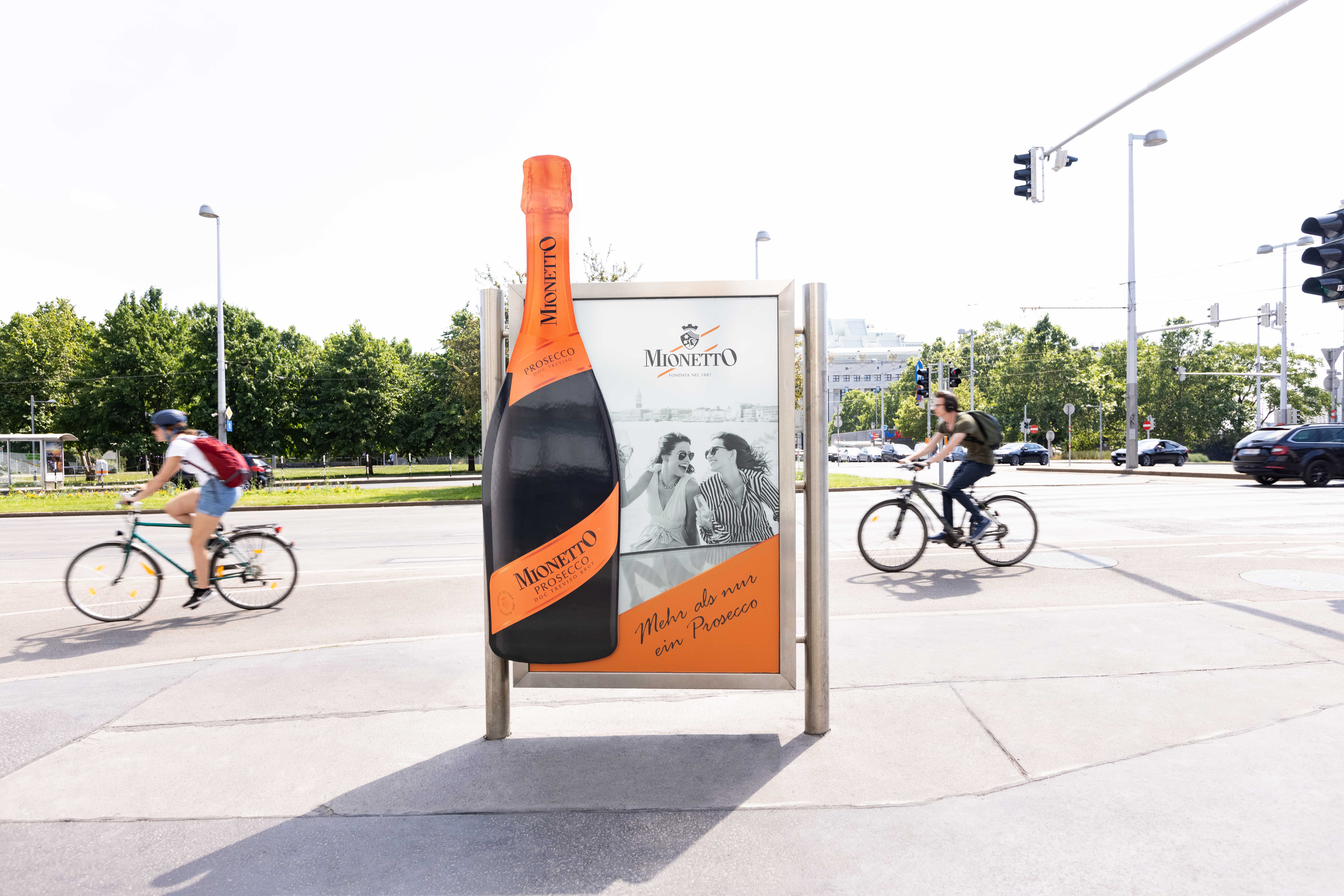 In cooperation with MediaCom, Mionetto relies on a sparkling Out of Home media mix by Gewista. The eponymous Prosecco, which is named after Francesco Mionetto, will not only be seen in Vienna on analog and digital City Lights displays, but also via creative, special advertising formats, bus shelter branding displays in Total Look as well as City Lights with 2D format blasts.