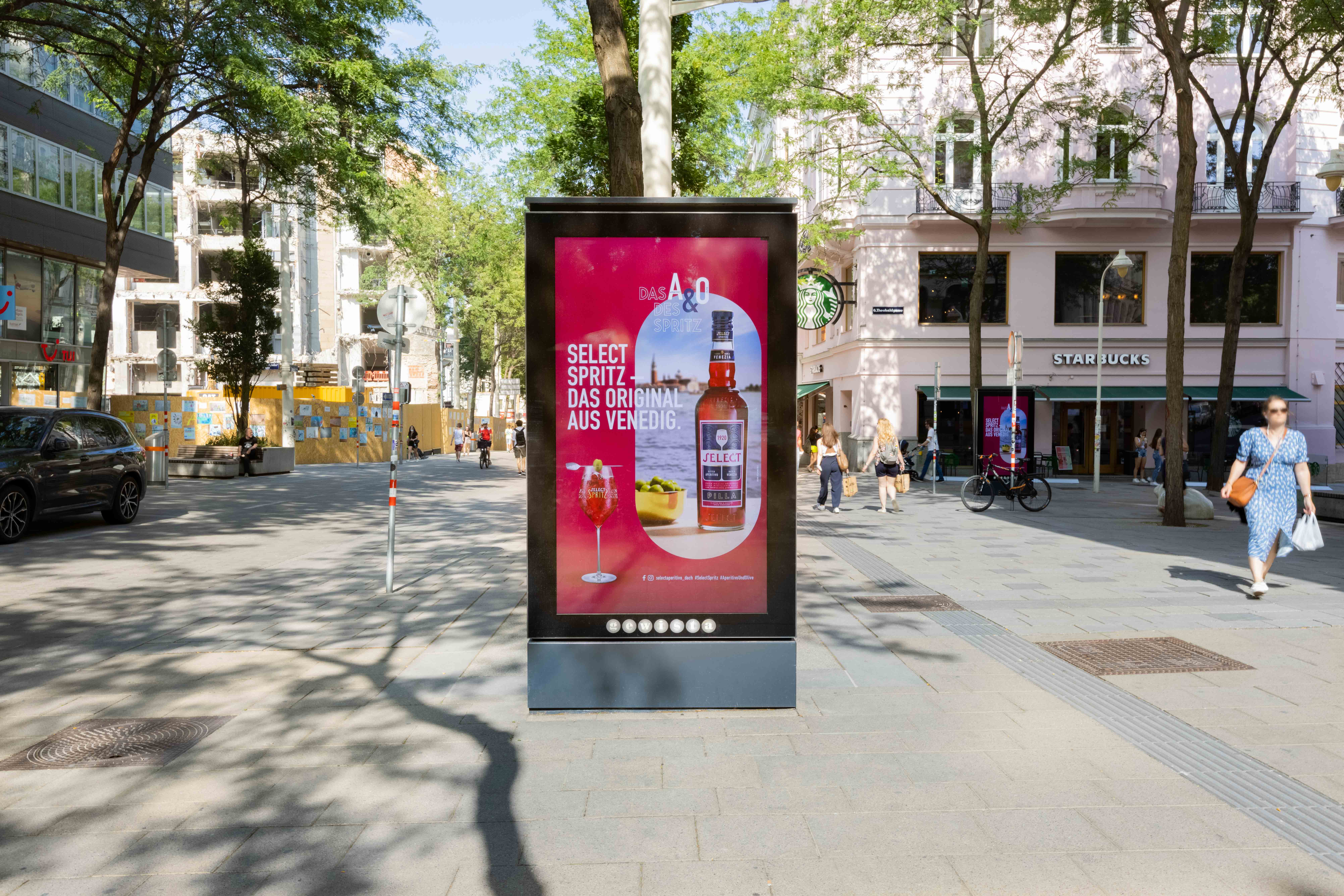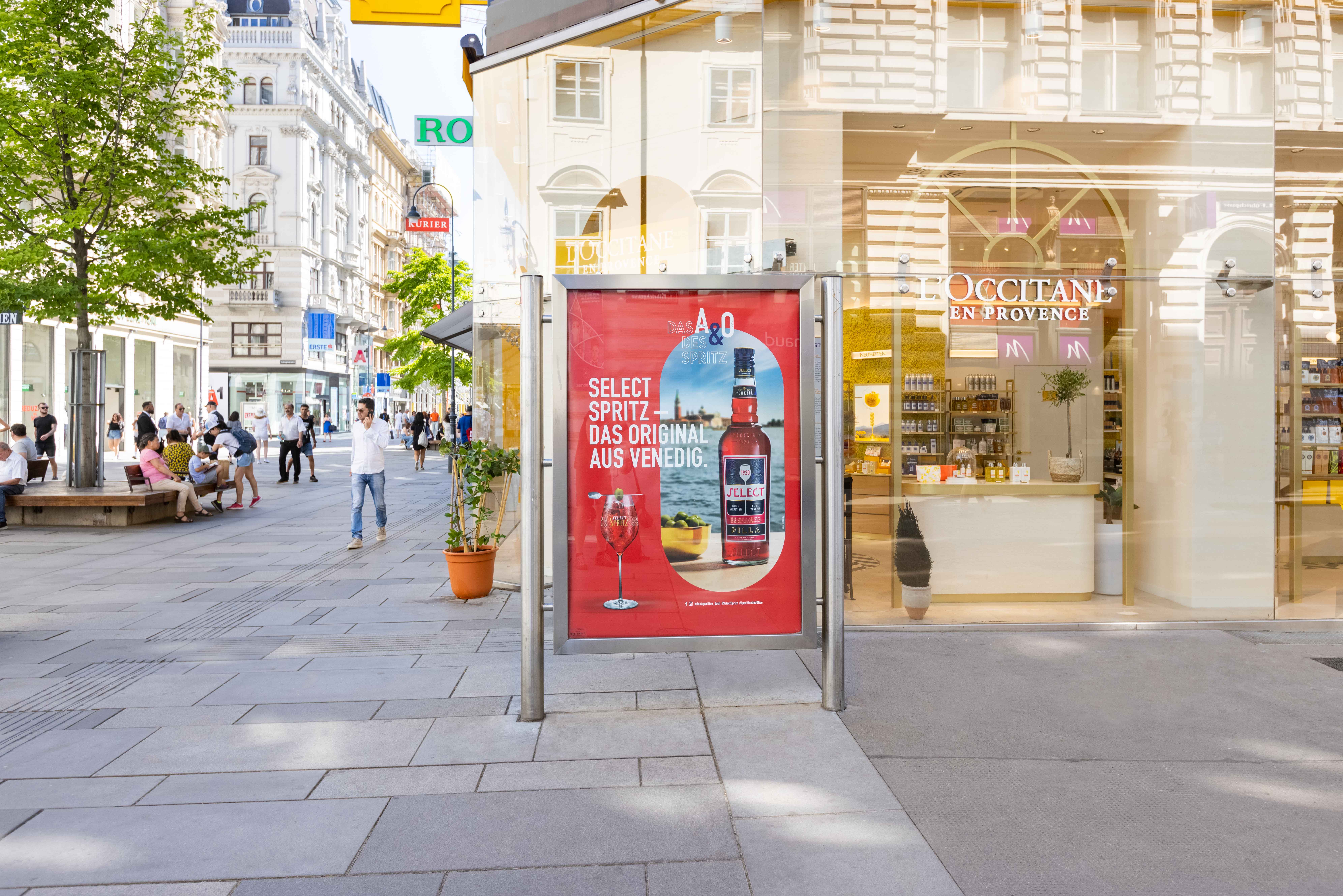 Select was created in 1920 in the heart of Venice at the Pilla distillery, famous for producing superb liqueurs. Select Aperitivo, with its refined aroma profile of 30 different botanicals and a balanced bittersweet taste, is the essential ingredient of the original Venetian Spritz. It’s perfectly ideal as a summer drink and equally suited for a large-scale and nationally disbursed Gewista Out of Home campaign. Thus, the star of the subject, a Select bottle placed in front of a Venetian background, with the slogans "Das A&O des Spritz!" [meaning “The A & O of Spritz!“] as well as "Select Spritz - Das Original aus Venedig" [meaning “Select Spritz – the Original from Venice“], can be seen on 16-sheet posters as well as on analog and digital City Lights in Vienna, which are focused and targeted around Point-of-Sale locations. The Gewista digital City Lights display features a ten-second video Select spot, which can be seen in Vienna's high-traffic subway stations at Stephansplatz and Volkstheater, as well as on Vienna's Mariahilferstrasse, and at selected hot spots in the city center.